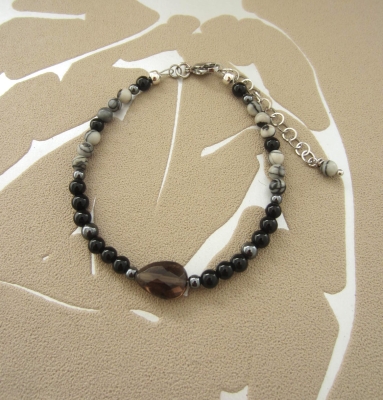 armband bestaande uit een centrale druppel van rookkwarts, verder kleine kraaltjes van onyx, jaspis en hematiet, afgewerkt met een karabijnslot en verlengketting van edelstaal
