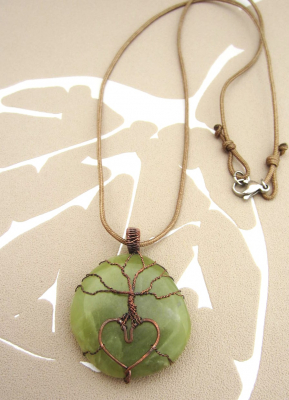 hanger bestaande uit een steen van groene aventurijn(3.5cm/3.5cm) omwikkeld met koperdraad (hartje met boom), aan een kakigroen paracord touw(verstelbaar) (54cm)afgewerkt met een karabijnslot van edelstaal