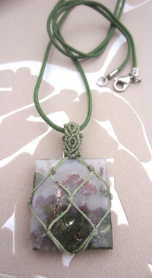 hanger met rechthoekige steen(3cm/3.5cm) van mosagaat, omwikkeld met groene macramédraad, aan een groen paracord touw(76cm)afgewerkt met een karabijnslot van edelstaal