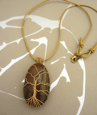 hanger bestaande uit een steen van tijgeroog (2.5cm/4cm) omwikkeld met messingdraad in een boomontwerp, aan een goudkleurig lederen touw (50cm)