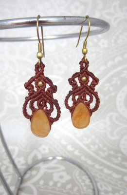 oorbellen bestaande uit een oranje druppel van agaat afgewerkt met een macramé ontwerp met roestbruine polyesterdraad, aan een oorhaakje van messing(nikkelvrij) L=3.7cm)