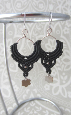 oorbellen bestaande uit een ring(1.5cm) van edelstaal met hieraan een macramé ontwerp met zwarte polyester draad met hieraan een bloemetje van edelstaal, aan een oorhaakje van edelstaal (L=5cm)