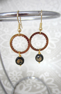 oorbellen bestaande uit een ring van edelstaal (1.5cm) met hieraan een kraal yinyang, aan een oorhaakje van edelstaal